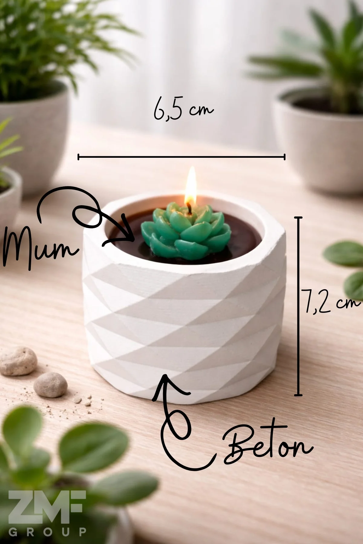 Ürün ölçüleri 2. fotoğrafta detaylı bir şekilde gösterilmektedir. Beton saksı, geometrik şekli ile dikkat çekerken, içerisinde yer alan dekoratif mum ise odanızı hoş bir atmosfere bürüyecek.
