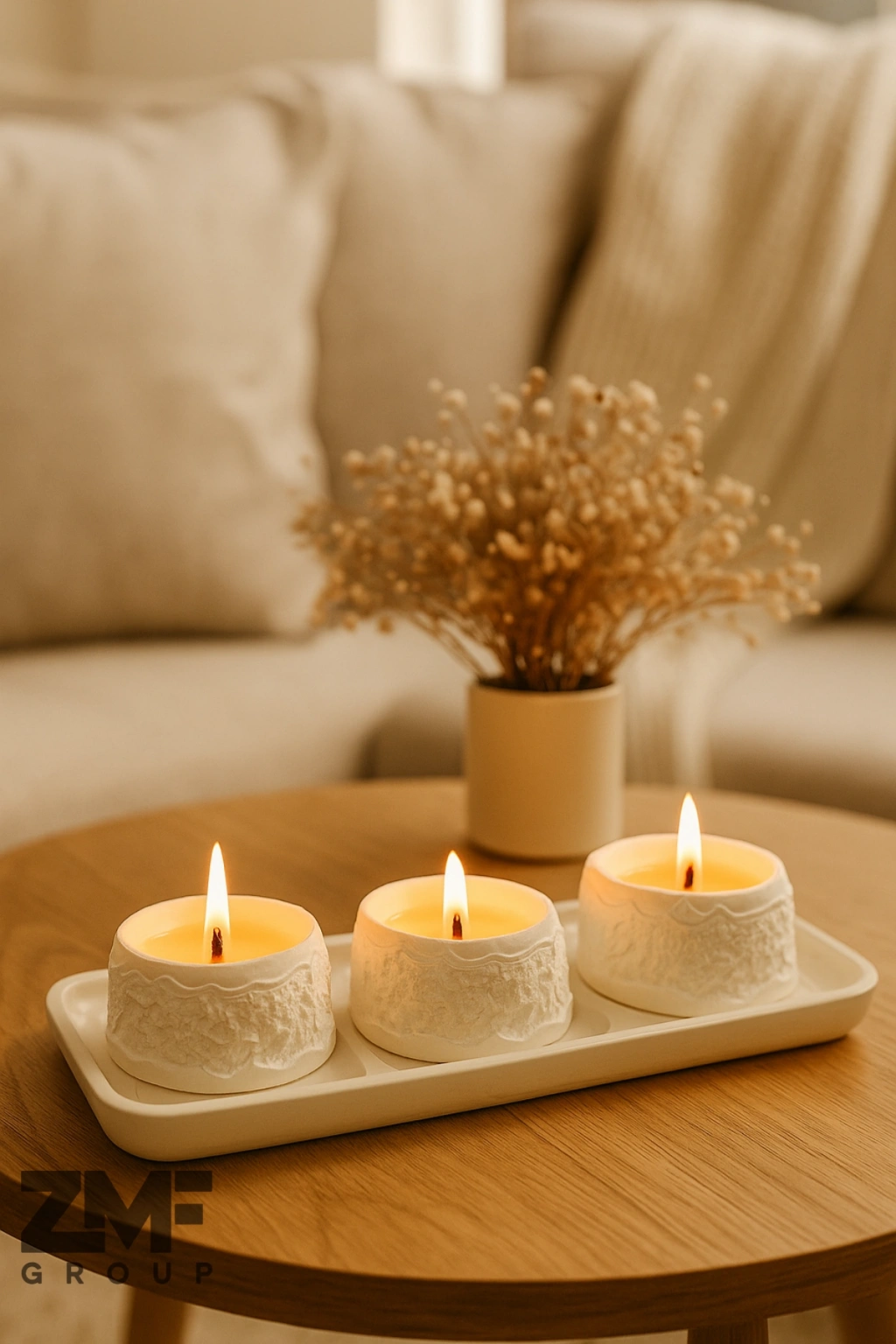 Dekoratif Tepside Kayalık Detaylı Üçlü Mum Seti, salon, yemek masası veya yatak odası gibi farklı alanlarda kullanılarak mekanınıza şıklık katacak.