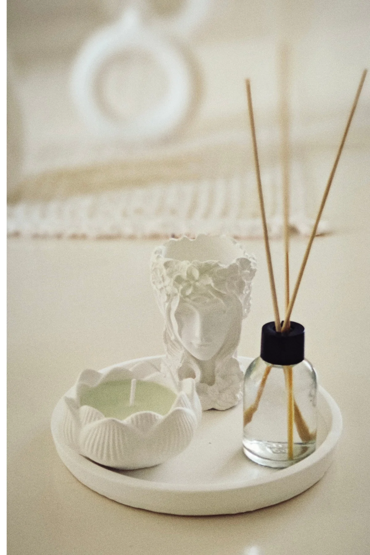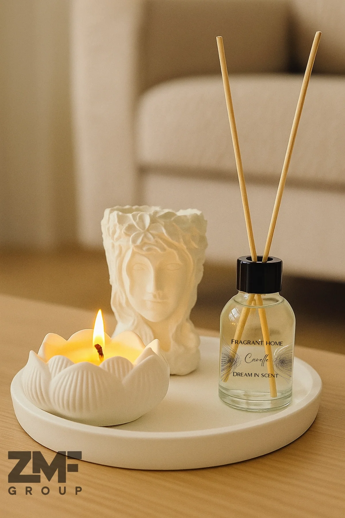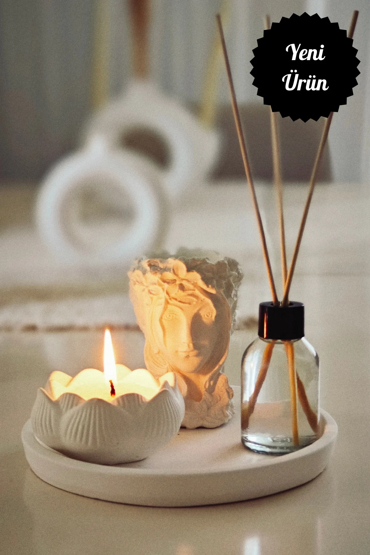 Özel koleksiyonumuzdan gelen bir şaheser! Tepside yer alan Tanrıça Helen figürü sukulent saksısı, bebek pudrası kokulu lotus mum ve oda kokusuyla bu set, ev dekorasyonunuza şıklık ve zarafet katacak.