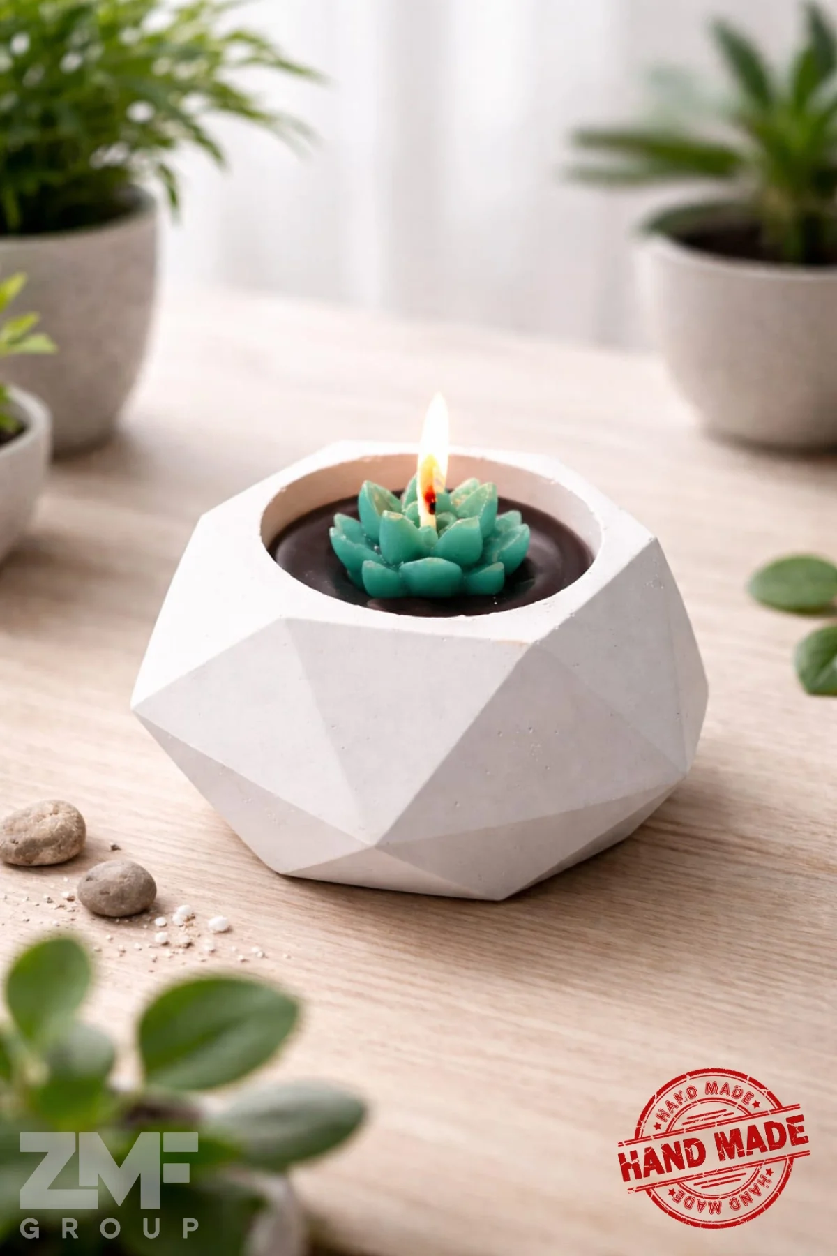 Ürün, yaratıcı tasarımı ve kaliteli malzemeleriyle dikkat çeker. Kristal formundaki beton saksının üstünde bulunan sukulent mum, şık bir görünüm sunar.